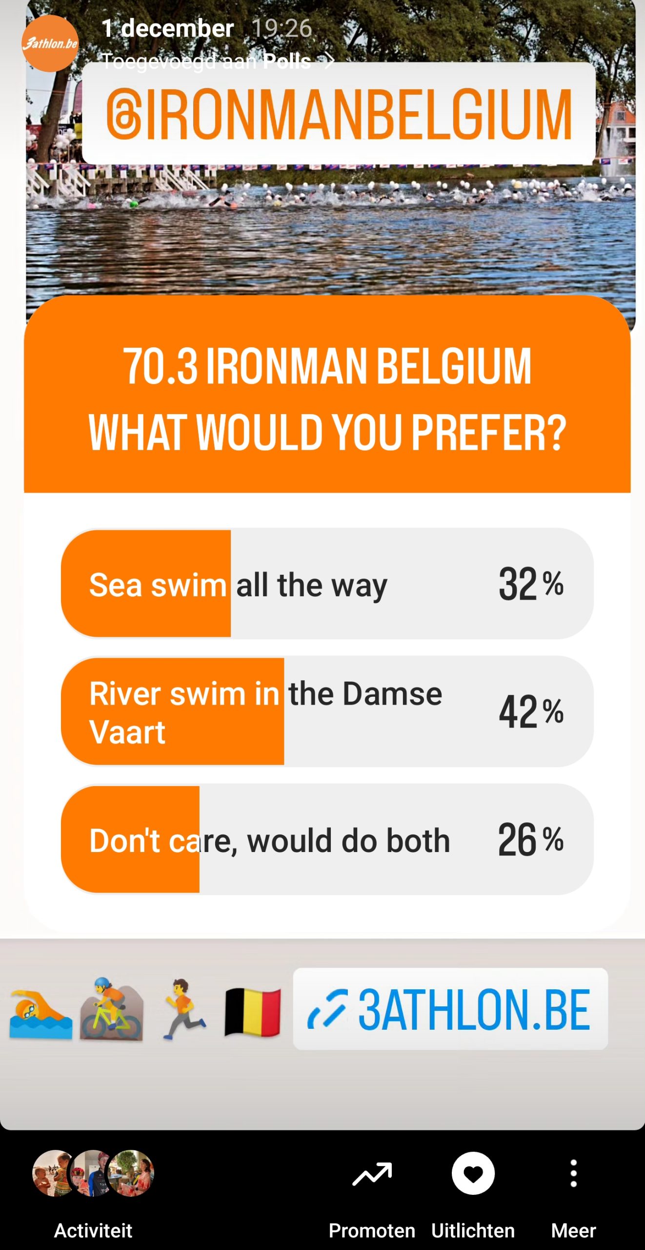 Wij vroegen in onze Instagram Stories waar de triatleten de voorkeur aan geven: zwemmen in zee of toch liever in het kanaal. Ruim 700 triatleten namen deel aan de Poll. Hieronder vind je de resultaten: